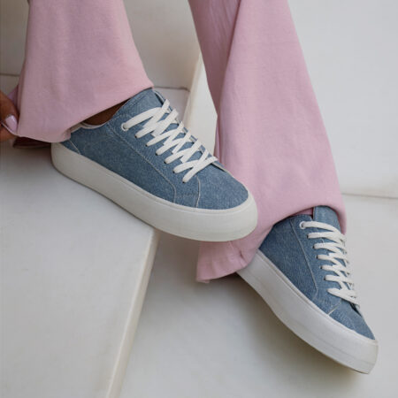 کتانی زنانه جین با طراحی ساده و سبک کژوال، مناسب استایلهای روزمره و اسپرت. ترکیب رنگ آبی جین با بند و زیره سفید، ظاهری جذاب و راحت به این کفش بخشیده است.