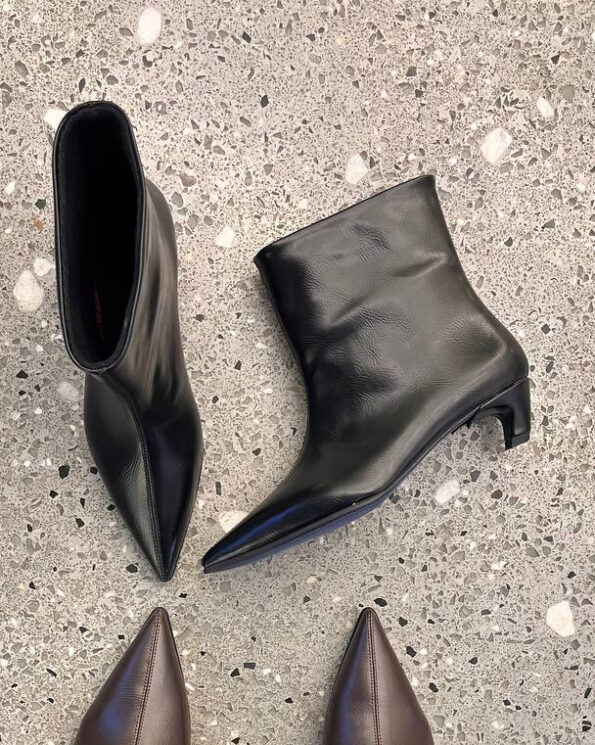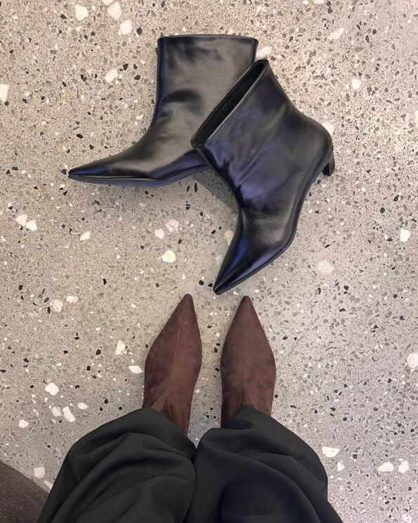 بوت زنانه چرمی با نوک تیز و پاشنهی کوتاه، طراحی مدرن و شیک مناسب استایلهای رسمی و روزمره.